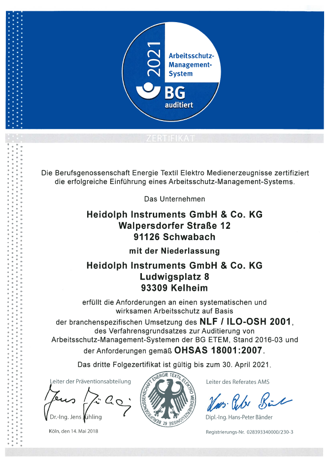 Wir sind der Meinung, dass wir den dauerhaften und umfangreichen Schutz unserer Mitarbeiter, nur mit einer Systemlösung gewährleisten können. Mit dem Arbeitsschutz-Managementsystem (AMS) der BG ETEM sind wir zum dritten Mal in Folge in der Lage, die Umsetzung dieser systematischen Präventionsmaßnahmen zertifizieren zu lassen. Somit erfüllen unser Unternehmen Heidolph Instruments in Schwabach, wie auch die Niederlassung in Kelheim, die Anforderungen an einen systematischen und wirksamen Arbeitsschutz auf Basis des NLF / ILO-OSH 2001. Besonders positiv zu erwähnen ist der Praxisbezug des AMS, das betriebliche Notwendigkeiten des Arbeitsschutzes individuell bewertet. So können wir als Premiumhersteller unserer Verantwortung gewissenhaft nachkommen, ohne an Agilität und Qualität im internationalen Marktumfeld zu verlieren.